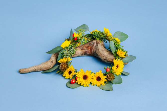 If you feel happiest in early fall with all of the yellows and reds of the season, you’ll swoon at this arrangement. Made up of Sunflowers, Cremones, Scabiosa Pods, Papoose Salal and Seeded Eucalyptus this colorful arrangement will be the perfect match for your sweet ceremony.